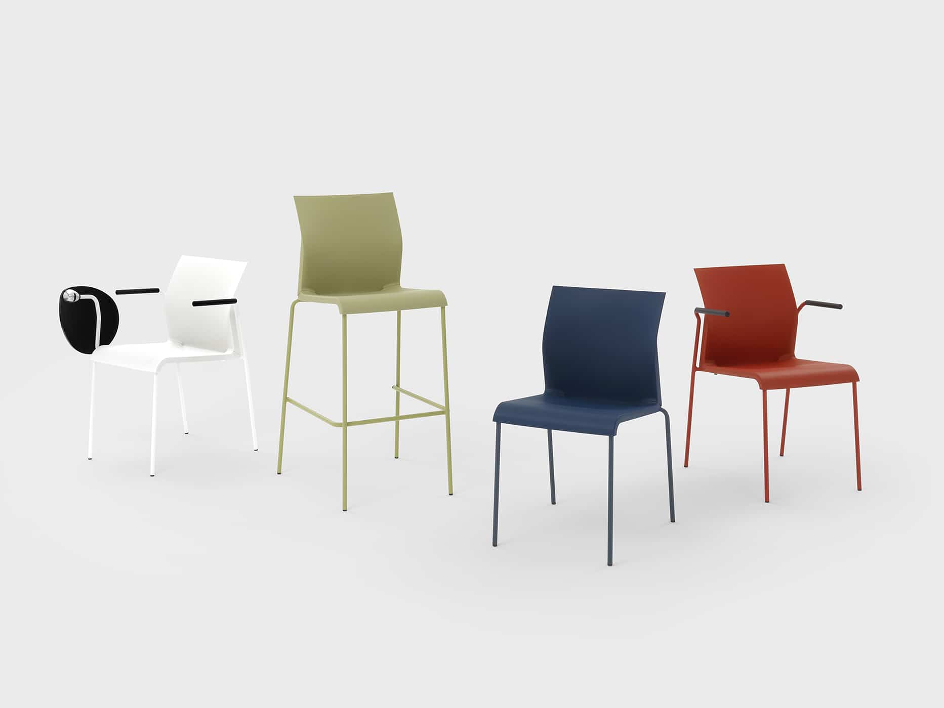 Structures available: POWDER COATED FINISH stacking 4-legged base in 16 mm steel tube, for chair with and without armrests.